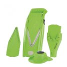 Изготовлена из нержавеющей стали и черного пластика – V-образное главное лезвие, второе – волнистое – Удобный механизм регулировки толщины нарезки – Две складные нескользящие ножки – Два дополнительных лезвия: жюльен и для нарезки картофеля-фри: 6 и 9 мм – Контейнер для безопасного хранения лезви..