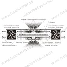 Особенность заключается в том, что оба вентилятора в рециркуляторе - вытяжные, а два воздухозаборника с защитой от внешнего проникновения прямых УФ-С лучей расположены на боковых гранях устройства. Такая конструкция позволяет увеличить скорость воздухопроходимости до двух раз, благодаря чему воздух обеззараживается быстрее. Также внутри корпуса рециркуляторра на крепежных отверстиях имеются герметичные крышки для удержания тяги (скорости движения воздуха). Корпус рециркулятора легко разбирается для пользовательского техобслуживания, а пылевые фильтры на вытяжных вентиляторах достаются вовсе без разбора корпуса - путем съема внешних крышек вентиляторов.