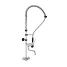 Смеситель с душящим устройством с дополнительным краном устанавливается на горизонтальную поверхность моечной ванны к профессиональной посудомоечной машине, а также используется для мытья овощей и фруктов.   Шланг устойчив к воздействию горячей воды 100 °С. Фиксатор для постоянно..