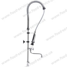 Смеситель с душирующим устройством с изливом применяется для установки на моечные ванны в кафе, барах, ресторанах, цехах и других местах для мойки посуды, инвентаря и продуктов. Душирующие устройство имеет специальный фиксатор, обеспечивающий постоянный напор воды, а также освобождает руку мойщика. Фиксатор легко включается и выключается одним пальцем. Ручной душ способный разворачиваться на 360°. PVC,  эластичный материал, гибкий прочный и нержавеющий шланг в металлической оплётке. Внутренние строение шланга  из каучук EPDM. Шланг устойчив к воздействию горячей воды до 100°С. Спираль-нержавейка  на поверхности шланги предотвращает перелом материала  и относится к классу AISI 304. Трубы, кран букс раковинного типа, арматура, система крепления, к стене из хромированной латуни. Концы спирали имеют защитный  слой пластмассы. Оснащён дополнительным смесителем. ...