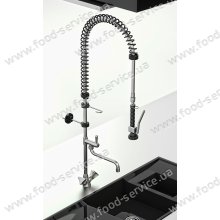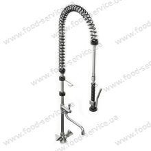 Смеситель с душирующим устройством с изливом применяется для установки на моечные ванны в кафе, барах, ресторанах, цехах и других местах для мойки посуды, инвентаря и продуктов. Душирующие устройство имеет специальный фиксатор, обеспечивающий постоянный напор воды, а также освобождает руку мойщика. Фиксатор легко включается и выключается одним пальцем. Ручной душ способный разворачиваться на 360°. PVC,  эластичный материал, гибкий прочный и нержавеющий шланг в металлической оплётке. Внутренние строение шланга  из каучук EPDM. Шланг устойчив к воздействию горячей воды до 100°С. Спираль-нержавейка  на поверхности шланги предотвращает перелом материала  и относится к классу AISI 304. Трубы, кран букс раковинного типа, арматура, система крепления, к стене из хромированной латуни. Концы спирали имеют защитный  слой пластмассы. Оснащён дополнительным смесителем. ...