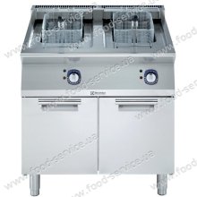 Фритюрница на закрытой базе с механическим управлением и прямым нагревом имеет две ванны каждая объемом 14л, две корзины размером 225х325х125мм и кран для сливания масла из ванны (приемный контейнер находится внутри закрытой базы).