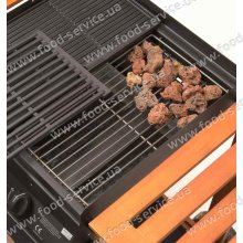 Гриль имеет встроенные колеса для удобного перемещения. Лавовые камни аршан входят в комплект поставки.