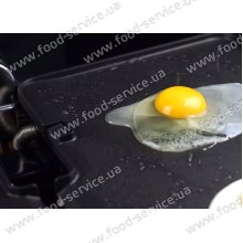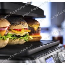 • Верхняя пластина откидывается на 180°, что позволяет использовать обе пластины одновременно в качестве жарочой поверхности для приготовления различных продуктов (например, мяса и овощей одновременно).