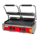 Электрический контактный гриль тостер с  ребристой поверхностью двойной.   Грили контактные Hendi предназначены для жарки мяса, сосисок, бутербродов, рыбы, а также яичниц, омлетов, блинов и др:   • терморегулятор позволяет устанавливать температуру от 0 до 300ºС;   • нагрев осуществляется одновременно сверху и снизу; • корпус выполнен из нержавеющей стали;   • рабочие поверхности чугунные с керамическим покрытием ;   • ручки выполнены из термостойкого материала; • съемный поддон для сбора лишнего жира; • давление верхней рабочей поверхности регулируется прижимной пружиной, что обеспечивает адаптацию к различной толщине приготовляемого продукта; • Световой индикатор нагрева •  Индикатор сети ON/OFF  • комплектуются щеткой для легкой очистки