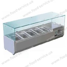 Холодильная витрина настольная под 5 гастроемкостей GN 1/4 (гастроемкость - опция) изготовлена ​​из нержавеющей стали AISI201, имеет прямое стекло и оборудована электронной панелью управления.   Напряжение 220В. Мощность: 0.15кВт. Габариты нетто ДхШхВ 1200х335х435мм. Вес нетто 36кг. Габариты ШхГхВ 1240х375х310мм. Температурный режим от +2 до +8˚С. Хладагент R600. Вес 49кг. Страна Китай. ...