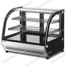 Настольная охлаждающая витрина оснащена двумя хромированными полками, в качестве нижнего уровня служит несъемная полка.