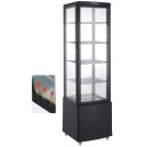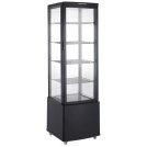 Холодильная витрина GoodFood RT235L3 черная напольная кондитерская с воздуховодом вне стекла для удаления конденсата и четырьмя хромированными полками используется для демонстрации кондитерских изделий.   Корпус изготовлен из черного пластика. Объем 235 л. Двухстороннее боков..