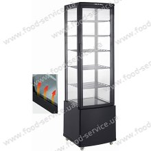 Холодильная витрина GoodFood RT118L черная используется для демонстрации прохладительных напитков или кондитерских изделий. Корпус изготовлен из пластика.   Двойной стеклопакет с 4-х сторон. Двухсторонняя боковая светодиодная (LED) подсветка. Хромированные полки. Дина..