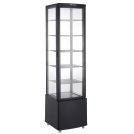 Холодильная витрина GoodFood RT235L3 черная напольная кондитерская с воздуховодом вне стекла для удаления конденсата и четырьмя хромированными полками используется для демонстрации кондитерских изделий.   Корпус изготовлен из черного пластика. Объем 235 л. Двухстороннее боков..