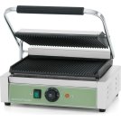 Гриль контактный GoodFood ECG11 GREEN однопостовый с одним регулятором мощности, широкой плитой и пружиной для фиксирования верхней плиты в любом положении.   Верхняя и нижняя плиты с ребристой поверхностью. Температура от 50 до 300°С. Мощность 2,2 кВт. Размеры верхн..