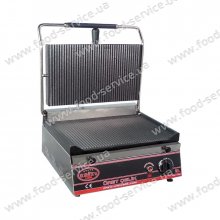 Имеет большую рабочую поверхность, что позволяет поместить 4-5 ролла шаурмы (хот-догов) для подогрева. Верхняя поверхность регулируется по наклону, посередине для этого предусмотрена ручка. Продукт прижимается верхней рабочей поверхностью и таким образом обжаривается с двух сторон одновременно. Для сбора жира предусмотрен съемный лоток, который также защищает корпус и панель управления гриля от попадания на них масла или продукта.