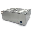 Мармит работает по принципу паровой бани - вода нагревается ТЭНом и при закипании создается пар, который подогревает вместимое гастроемкостей. Для контроля температуры подогрева предусмотрен термодатчик с проградуированой ручкой со стороны обслуживающего персонала. Возможна различная комбинация гастроемкостей.