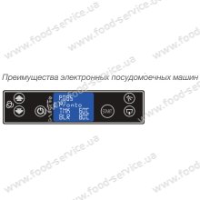 1. Цифровой LED дисплей, который отображает состояние посудомоечной машины с указанием температуры воды в моечной ванне и бойлере, обратный отсчет времени во время цикла мойки и оповещает о завершении цикла мойки с мигающей подсветкой дисплея.