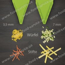 Вставка с ножами 7 мм. Имеет два положения - соломка, брусочки, кубики и пр. толщиной 7*7 мм в одном положении и 7*3,5 мм во втором положении.