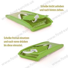 Безножевые вставки, одна из которых двухсторонняя, позволяют нарезать 3 толщины колечек и пластинок. Капуста, помидоры, колбаса, баклажаны, лимоны, лук, грибы - можно отлично нарезать с регулировкой на 3 толщины (1,8мм; 3,5мм; 5,5мм). Кроме того, одну из вставок можно поставить в положение "блок" и закрыть этой вставкой наглухо лезвия на основной раме во время её хранения. Изменение толщины нарезки происходит путем замены вставки на другую.