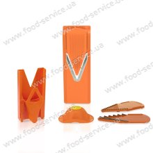 Ручной слайсер для овощей и фруктов Berg используется для резки фруктов и овощей. Безопасный держатель с толкателем облегчит скольжение и поможет избежать травм, ведь при нарезании руки не касаются лезвия. Толщина вырезки регулируется. Копус изготовлен из пластика. ..