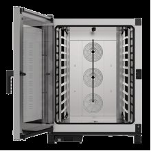 Печь предназначена для выпечки кондитерских и хлебобулочных изделий, в том числе и из замороженных полуфабрикатов. Вмещает 10 противней формата GN 2/1.  Камера выполнена из нержавеющей стали высокой прочности AISI 304 с закругленными углами для гарантии максимальной гигиены. Освещение камеры выпечки с помощью внешней лампы LED. Паронепроницаемая панель управления MASTER.Touch. Единица измерения температуры устанавливаемая оператором в °C или °F. Прочная дверная ручка  - внутренний штифт изготовлен из углеродного волокна. Печь оснащена емкостью для сбора жидкости большой вместимости, подсоединенной к сливу. В конструкции применены инновационные материалы, благодаря которым печь имеет небольшой вес. Дверца оборудована контактным сенсором. Предусмотрена система самодиагностики для поиска неисправностей. Внутреннее открывающееся стекло для удобной чистки. Направляющие для противней с зубчатыми нишами для облегчения загрузки-выгрузки. 8 скоростей вентилятора (4 с реве...