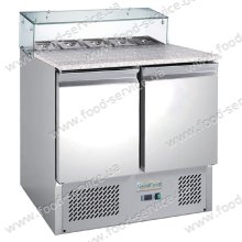 Корпус изготовлен из AISI 304, столешница из гранита.   Общий объем 240 л. 2 полки GN 1/1. Мощность 0,28кВт. Размер гастроемкостей GN 1/6 – 5 шт. Статическая система охлаждения. Температура от +2 до +8 °C. Цифровой терморегулятор. Магнитная уплотнительная ..