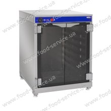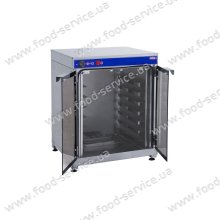 Заданная температура процесса расстойки поддерживается автоматически. Визуальный контроль процесса прост, поскольку осуществляется через стеклянные двери.  Конструкция оборудования обеспечивает равномерное распределение температуры по всему объему шкафа. Высота между направляющими для противней – 80 мм.