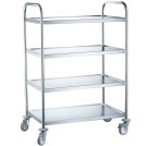 Тележки сервировочные c 4-мя полками предназначены для перемещения на предприятиях общественного питания продуктов, готовых блюд, напитков, и посуды, а также для подачи грязной посуды из зала в моечное отделение.   Выполнена из нержавеющей стали 3 полки с шумопоглощающим материалом сн..