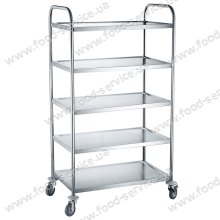 Тележки сервировочные c 5-мя полками предназначены для перемещения на предприятиях общественного питания продуктов, готовых блюд, напитков, и посуды, а также для подачи грязной посуды из зала в моечное отделение.