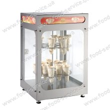 2 Круглые вращающие полки на 32 готовых рожков коно-пиццы. Узел съемный В комплекте узел с 2 полками для хранения и демонстрирования других изделий, расстояние между полками 10 см Детали контактирующие с продуктом выполнены из пищевой нержавеющей стали Поддерживаемая температура от 20 до 80° C; Регулируемый термостат; Встроенная система пароувлажнения - защищает продукт от пересыхания Динамический нагрев, с помощью вентилятора Встроенная подсветка внутри витрины ...