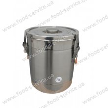 Термоведро - это специальная ёмкость, в которой помещенный внутрь продукт защищен от действия низких или высоких температур на определенное время. Принцип действия - обычный термос, который благодаря своей конструкции прекрасно сохраняет исходную температуру продукта. Термоведро изготовлено полностью из нержавеющей стали. Крышка имеет специальный уплотнитель и благодаря крепким зажимам плотно прилегает к емкости. Такая конструкция гарантирует, что продукт не прольется при перевозке. Предназначен для транспортировки пищи с сохранением её температуры (холодной или горячей). Применяется для выездной торговли, кейтеренга, для организации фуршетов на открытом воздухе и в местах, где нет возможности использовать электроэнергию.