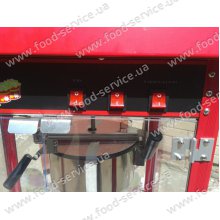 Червоний колір апарату і яскрава наклейка з боку покупця приваблює ще більшу увагу потенційних клієнтів. В апараті передбачений підігрів готового попкорну і підсвічування, для більш вигідною його демонстрації.
