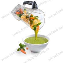 Контейнер з полікарбонату - 2,0 л. Він має більш широке дно, що сприяє постійному обертанню інгредієнтів і запобігає утворенню порожнин в напої. Час змішування скорочується на третину. Більше не потрібно струшувати чашу при змішуванні! Стакан оснащений універсальним ножем спеціальної конфігурації із загартованої нержавіючої сталі - 4 рівня нахилу лопаті збивання, який, сприяє значному збільшенню швидкості змішування та зменшення часу приготування напоїв.