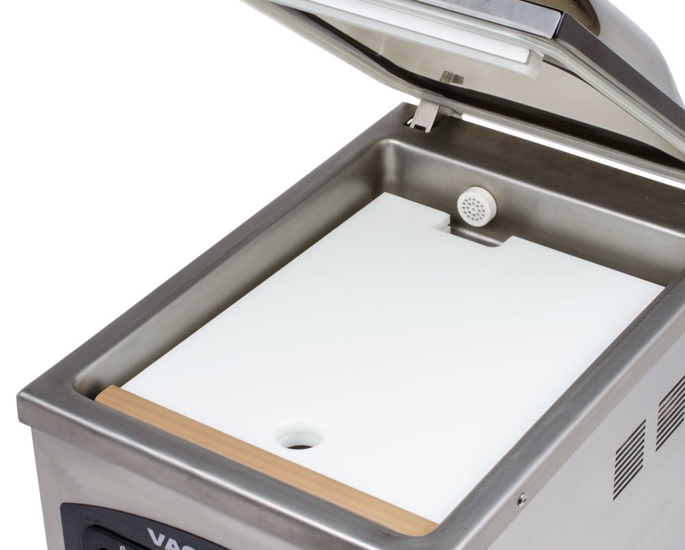 Коли потрібно упакувати невеликі пакети, можна використовувати спеціальні пластини, які зменшують незаповнений простір камери вакуумування і тим самим зменшити час вакуумування і навантаження на насос. Коли потрібна вся камера для великогабаритного товару, треба просто вийняти ці пластини.