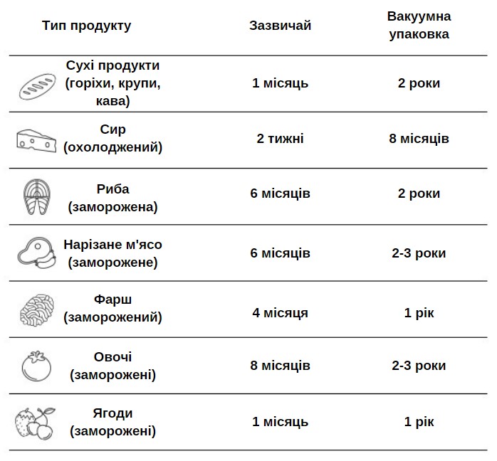Вакуумна упаковка значно збільшує термін зберігання продуктів, що скорочує кількість відходів і економить Ваші гроші. Термін зберігання багатьох видів продуктів різко збільшується, наприклад: