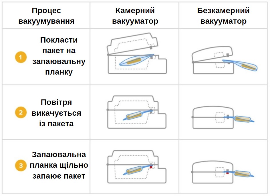 Безкамерний вакууматор - чудовий вибір, якщо Ви будете упаковувати у вакуумі час від часу і якщо Ви не будете вакуумувати мокрі продукти і рідини. Цей тип упаковщиків коштує набагато дешевше, ніж камерні машини, і забезпечує відмінну герметичність, але їм не вистачає універсальності та продуктивності, які може забезпечити камерний вакууматор. Якщо Ви вперше пробуєте вакуумувати або знаєте, що Вам потрібна модель з малою продуктивністю, безкамерний упаковщик - ідеальне рішення.