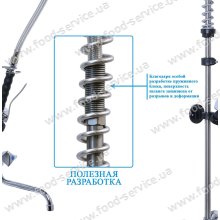 Змішувач з душуючим пристроєм з виливом застосовується для установки на мийні ванни в кафе, барах, ресторанах, цехах та інших місцях для миття посуду, інвентарю та продуктів. Душуючий пристрій має спеціальний фіксатор, що забезпечує постійний натиск води, а також звільняє руку мийника. Фіксатор легко включається і вимикається одним пальцем. Ручний душ здатний розвертатися на 360°. PVC,  еластичний матеріал, гнучкий міцний і нержавіючий шланг в металевому обплетенні. Внутрішня будова шлангу з каучук EPDM. Шланг стійкий до дії гарячої води до 100°С. Спіраль-нержавійка на поверхні шланги запобігає перелом матеріалу і відноситься до класу AISI 304. Труби, кран букс, арматура, система кріплення, до стіни з хромованої латуні. Кінці спіралі мають захисний шар пластмаси. ...