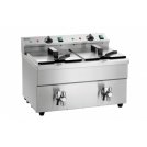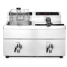 Фритюрниця електрична Apach APFE-77T настільна призначена для приготування страв в маслі на підприємствах громадського харчування і торгівлі. Фритюрниця обладнана електромеханічної панеллю управління. У фритюрниці передбачена холодна зона, що дозволяє збільшити час використання масла. Корпус, ванни, робоча поверхня, панель управління і витяжна решітка виконані з нержавіючої сталі AISI 304, бічні і задня панелі - з нержавіючої сталі AISI 430, кошики - з хромованого сталевого дроту, нагрівальні елементи, фільтри і кришки кошиків - з нержавіючої сталі.
