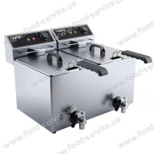 Фритюрниця електрична Saro EF 88 настільна професійна виготовлена з нержавіючої сталі.   Розмір кошика 2х200х220х145мм. Габаритні розміри ДхШхВ 590x420x378мм. Напруга 400В. Температура 60-200°С. Температури регулюється поворотною ручкою термостата. Об'єм 8+8л. ДхШхВ 590х420х387мм. Напруга 220В. Потужність 2x3кВт. Бак для масла з "cold zone" сприяє більш тривалому використанню олії. Знімна ємність для олії має заокруглені кути. Швидке нагрівання робочої зони. Нагрівальні ТЕНи знімні. Запобіжний термостат, для попередження перегрівання фритюрниці. Блок управління зверху фритюрниці, що запобігає потраплянню олії. Світлові індикатори включення і досягнення заданої температури. Ніжки. 2 крани для зливу. 2 окремі зони нагріву. ...