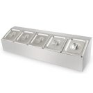 Підставка для гастроємностей Berg GN1/6х5 (176х162мм) настільна виконана з нержавіючої сталі підходить для розміщення гастрономічних контейнерів з продуктами (соуси, топінги, інгредієнти салатів).   Одна лінія під 5 шт GN1/6-100.   Розмір 830х245х210мм.   Га..