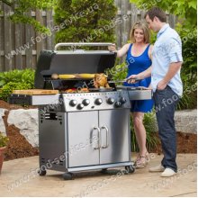 Серія газових грилів Baron компанії Broil King має дуже потужні подвійні трубчасті пальника з нержавіючої сталі. Корпус гриля виготовлений з литого алюмінієвого сплаву, що виключає корозію. Технологія Sure-Lite ™ Ignition дозволить запалити Вашу пальник при будь-яких погодних умовах. Смаження решітка з чавуну. Камера великого розміру і великої глибини зі стінками великої товщини. Це дозволяє отримати ще більший контроль над приготуванням їжі. Модель має додаткову конфорку і пальник гриль і крутив з мотором для додання апетитною скоринки вашим кулінарним шедеврам.