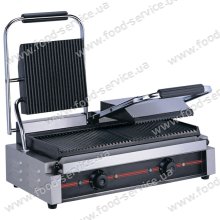 Грилі контактні призначені для смаження м'яса, сосисок, бутербродів, риби, а також яєчні, омлетів, млинців та ін:   • терморегулятор дозволяє встановлювати температуру від 50 до 300 °С;   • нагрів здійснюється одночасно зверху і знизу; • корпус виконаний з нержавіючої сталі;   • робочі поверхні чавунні з керамічним покриттям;   • ручки виконані з термостійкого матеріалу; • знімний піддон для збору зайвого жиру; • тиск верхньої робочої поверхні регулюється притискною пружиною, що забезпечує адаптацію до різної товщини продукту; • Світловий індикатор нагріву •  Індикатор мережі ON/OFF