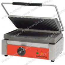 Електричний контактний гриль Stalgast Panini з ребристою поверхнею.   Грилі контактні Hendi призначені для смаження м'яса, сосисок, бутербродів, риби, а також яєчні, омлетів, млинців та ін:   • терморегулятор дозволяє встановлювати температуру від 0 до 300 °С;   • нагрів здійснюється одночасно зверху і знизу; • корпус виконаний з нержавіючої сталі;   • робочі поверхні чавунні з керамічним покриттям;   • ручки виконані з термостійкого матеріалу; • знімний піддон для збору зайвого жиру; • тиск верхньої робочої поверхні регулюється притискною пружиною, що забезпечує адаптацію до різної товщини продукту; • Світловий індикатор нагріву •  Індикатор мережі ON/OFF  • комплектуються щіткою для легкого очищення