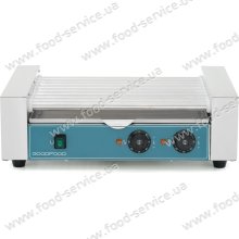 Гриль роликовий GoodFood HDRG5 BLUE для сосисок хот-дог з 1-м регулятором потужності.   5 роликів виконані з харчової нержавіючої сталі завдовжки 450мм. Температура від 50 до 300°С. Електродвигун має металеві шестерні та витримує інтенсивні навантаження. Потужність 0..