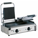 Якщо цей професійний контактний гриль являє собою великий контактний гриль, спеціально призначений для приготування гамбургерів або біфштексів в великих кількостях за розміром, його також використовують для підсмажування бутербродів або для приготування стейків. Верхні пластини цього професійного контактного гриля є самобалансуюча. Кожна прижимна пружина регулюється для адаптації приготування їжі до їжі. Цей м'ясний гриль також доступний з гладкою нижньої пластиною для приготування омлетів, смажених яєць, тортів, шведського хліба, млинці і т.п.