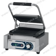 Грилі контактні Saro PG 1 призначені для смаження м'яса великим шматком, сосисок, бутербродів, стейків з риби: • корпус виконаний з нержавіючої сталі; • модель має рифлені робочі поверхні, виконані з чавуну; • нагрів здійснюється одночасно зверху і знизу; • терморегулятор дозволяє встановлювати температуру від 50 до 300 °С; • час приготування продукту - не більше 2,5 хв; • ручки виконані з термостійкого матеріалу; • знімний піддон для збору зайвого жиру; • тиск верхньої робочої поверхні регулюється притискною пружиною, що забезпечує адаптацію до різної товщини продукту;