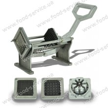 Апарат для нарізання картоплі фрі GoodFood VC03 ручний, не електричний. Корпус виготовлений з алюмінієвого сплаву, ножі з нержавіючої сталі.   Монтаж на край столу. Давити на важіль і рифлена пластина продавлює картоплю крізь ножі. Розмір ножів: 8x8 мм, 12х12 мм, 15х15 мм..