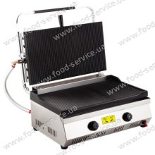 LPG або природний газ. Електропідпал Розхід газу: 0,13 m3/h – 0,18 m3/h – 20 mbar – 1550 kcal. Корпус виконаний з нержавіючої сталі. Модель має 1 пару (верх + низ) робочих рифлених поверхонь, виконаних з чавуну. Нагрівання здійснюється одночасно зверху і знизу таким чином, що температура 2-х робочих поверхонь регулюється незалежно. Інтенсивність подачі газу регулюється. Ручки виконані з термостійкого матеріалу. Знімний піддон для збору зайвого жиру. Тиск верхньої робочої поверхні регулюється притискною пружиною, що забезпечує адаптацію до різної товщини продукту.