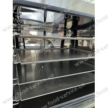 Конвекційна піч 600x400 зі зволоженням Vesta 0N0464M_H з дверима з подвійним склом.   Відстань між деками 80мм. Країна виробник Італія. Місткість камери: 4 дека 600*400*20мм. Напруга 380В. Потужність 5.5кВт. Температурний режим 50–270°C. Зволоження. AISI43..