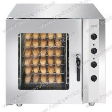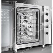 Корпус і камера виконані з нержавіючої сталі. Деко і гастроємності в комплект поставки не входять.   Режими приготування: Конвекція Конвекція + Парозволоження   Особливості : Парозволоження за допомогою прямого вприскування, ручний режим Регулятор випускання пари Кількість вентиляторів: 2 Вентилятори обертаються в протилежних напрямках з синхронною зміною напрямку обертання Таймер 0-60 хв. Охолоджувана дверцята з потрійним склінням повністю відкривається для зручності миття Особливості відкриття дверцят: дверцята з поворотним відкриттям з лівобічними петлями, система відкривання дверцят в два етапи для виходу пара з робочої камери Підключення до водопровідної мережі з нарізним сполученням 3/4 на задній стінці Регульовані ніжки