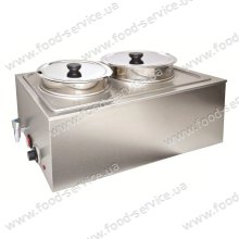 Марміт водний Airhot SB-2 призначений для підтримки в гарячому стані перших і других страв, гарнірів та соусів на підприємствах громадського харчування і торгівлі. Модель оснащена 2 ємностями по 8л. Працює за принципом парової бані: вода нагрівається теном і при нагріванні утворюється пара, який підігріває місткістю гастроемкости. Для контролю температури підігріву передбачений термодатчик з проградуйованою ручкою з боку обслуговуючого персоналу. Корпус виконаний з нержавіючої сталі. Підійде для комплектації ліній роздач малих і великих закладів громадського харчування, а також теплових блоків гарячих цехів і ресторанів....