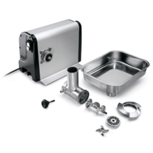 Насадка і ніж м'ясорубки виготовлені з нержавіючої сталі. Легко знімається горловина м'ясорубки повністю виконана з нержавіючої сталі AISI 304.