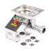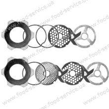 М’ясорубка складається з корпусу, в якому обертається шнек, затискної гайки, двосторонніх ножів, набору ножових решіток, кільця упорного і ножа підрізного. на передній частині корпусу м'ясорубки є зовнішня різьба, на яку нагвинчується гайка затискна, а на задній частині - фланець, яким корпус кріпиться до приводу. Шнек, корпус шнека і затискна гайка виготовлені з масивної нержавіючої сталі. Виключена деформація, як у випадку з корпусом з інших металів. З метою отримання фаршу різного ступеня подрібнення машини забезпечені набором ножов...